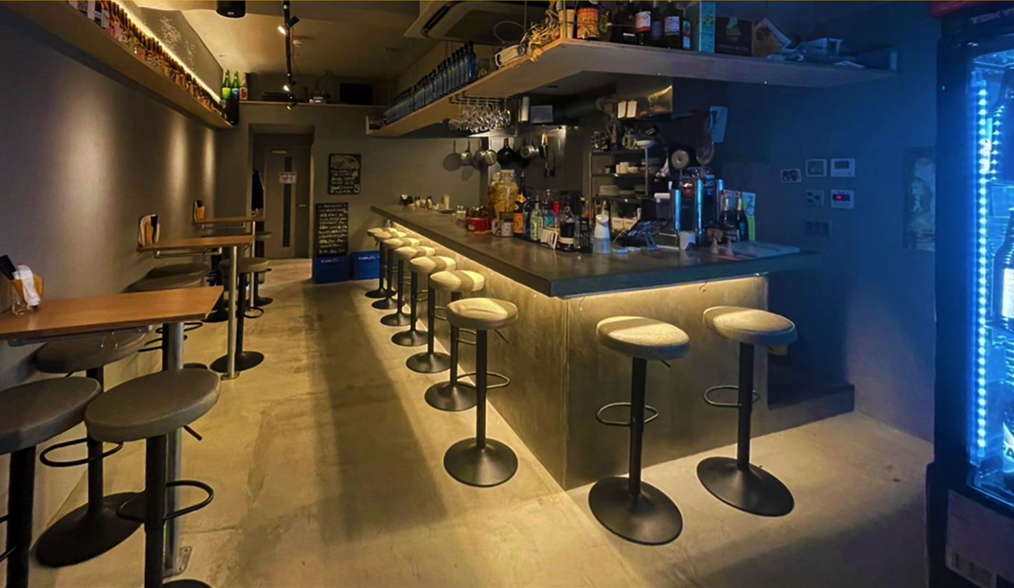 京都ではよく見かける、ウナギの寝床のような長細い店内。入口付近は通路のようになっています。店の奥に進むと、カウンター席とプロジェクター。そして、ショーケースを兼ねた冷蔵庫にずらりと関西のクラフトビールが並びます。